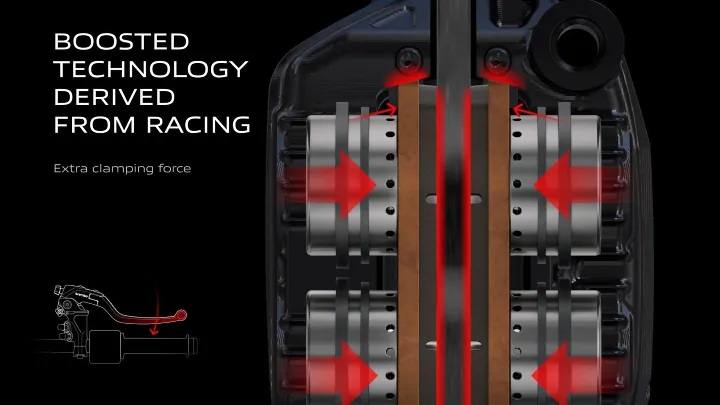 Brembo GP4-HY卡鉗內部並設計有倍力器機後,能夠更有效率的放大騎士