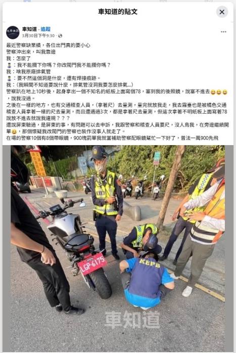之後在一樣的地方,也有交通稽查人員,(拿著尺)去量測,量完就放我走,我去霧臺也是被橘色交通稽查人員拿著一樣的尺去量測,而且還遇過3次,都是拿著尺去量測,但這次拿著不明紙板上面寫著78說放不進去就說我違規???