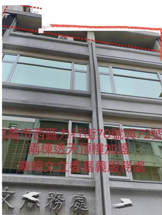 2024大選年,政治人物違建議題被放大檢視,包括民眾黨主席、總統參選人柯文哲、前立委黃國昌近期都爆出違建爭議,柯、黃兩人選擇「拆除」,並坐等民進黨總統參選人賴清德如何處理違建之外。《民報》也接獲一封檢舉函,內容清楚點出,民進黨嘉義縣立委陳明文父子於嘉義市的三棟建物,涉有違反《建築法》規定,被依法提出檢舉;陳明文服務處則尚未接到通知。
