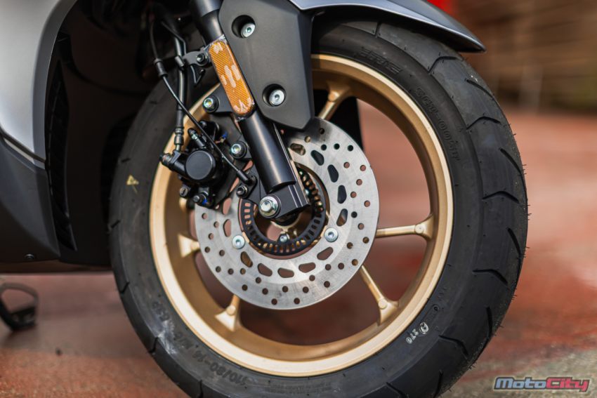 Aerox SP制動系統為前後碟式煞車配置.SP版除了標配有ABS煞車防鎖死